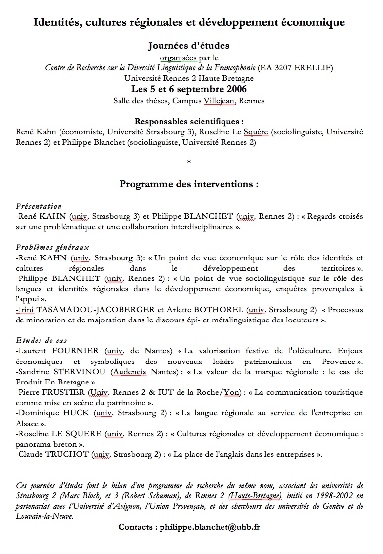 Journées d’études « Identités, cultures régionales et développement économique » organisées par le Centre de Recherche sur la Diversité Linguistique de la Francophonie (EA 3207 ERELLIF)