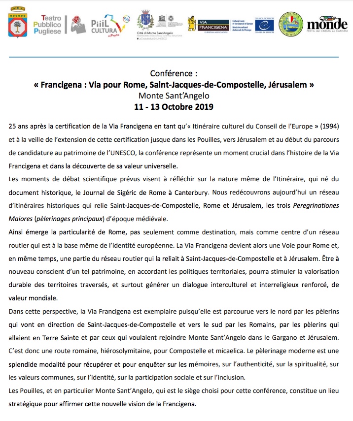 Dans le cadre de la conférence « Francigena : Via pour Rome, Saint-Jacques-de-Compostelle, Jérusalem » organisée par la Région des Pouilles (Italie) et l’Association Européenne de la Via Francigena)