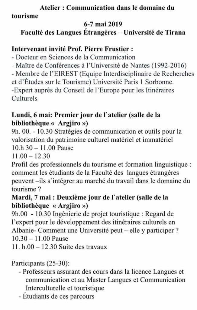 2019 : Ateliers de communication dans le domaine du tourisme (Tirana, Albanie)