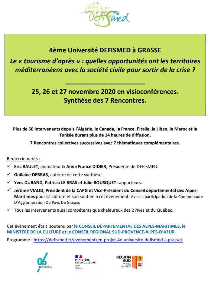Conférence internationale organisée par l’ONG DéfisMed en visioconférence, depuis Grasse (France). Participation à l’atelier « Des producteurs en grand nombre répartis dans les territoires. Comment les révéler, les accompagner et maîtriser les impacts ? » pour parler du potentiel de développement local apporté par les itinéraires culturels du Conseil de l’Europe.