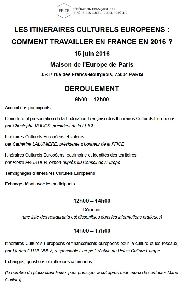Intervention dans le cadre de la journée d’études « Les itinéraires culturels européens : comment travailler en France en 2016 ? » organisée par la FFICE (Fédération Française des Itinéraires Culturels Européens).
