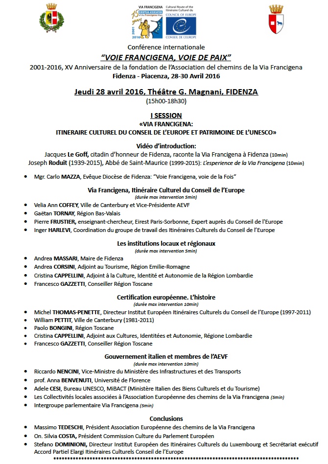 Intervention à l’AG de la Via Francigena, itinéraire culturel du Conseil de l’Europe (septembre 2018, Fidenza, Italie)